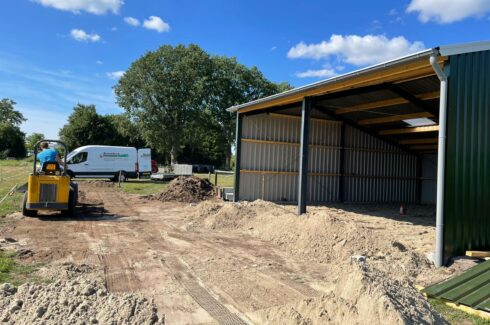 Wij hebben hier de grond voorbereid voor het straatwerk, de graskeien moesten dienen als oprit naar de schuur toe en in de schuur hebben we H-klinkers gelegd. Zo hebben we de klant compleet ontzorgt.