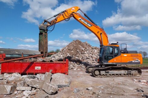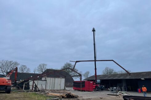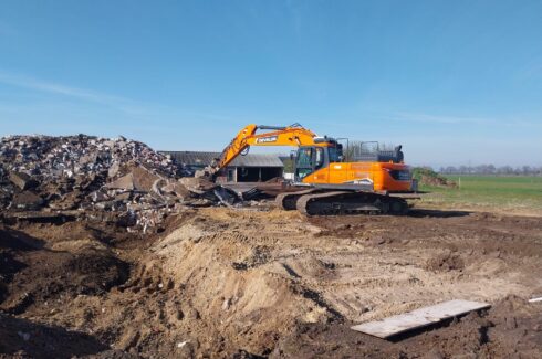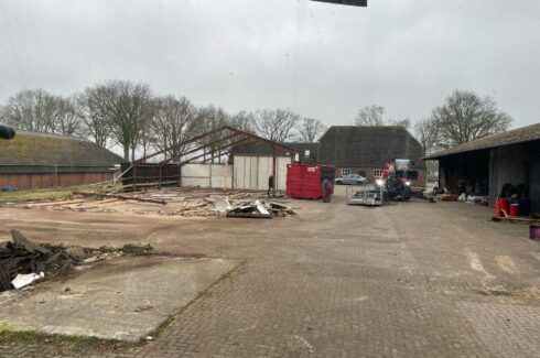 Daarna hebben we de 65 meter lange pluimveestal / kippenstal volledig gesloopt. Hierbij zijn de asbestvrije golfplaten verwijderd, alle isolatie en stalinrichting gedemonteerd, en is de complete constructie weggehaald. Ook de vloer, bestrating en fundering zijn uitgebroken. Het vrijkomende puin is ter plaatse gebroken en direct hergebruikt, in combinatie met aangevoerd menggranulaat,