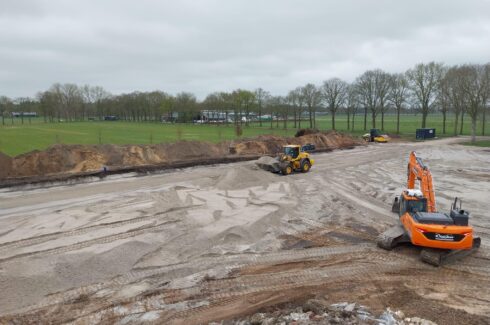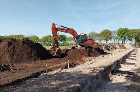 Vervolgens is een grote hoeveelheid zand aangebracht en met shovel en laserblad nauwkeurig geëgaliseerd, waardoor het terrein een stabiele en perfect vlakke ondergrond kreeg voor de nieuwbouw van de stal en loods. Voor de nieuw te bouwen loods en stal hebben we diverse grond- en funderingswerkzaamheden uitgevoerd. Zo zijn de funderingsstroken uitgegraven, later weer aangevuld en zorgvuldig uitgevlakt. De grond die tijdens het uitgraven vrijgekomen is hebben we later gezeefde met de rupskraan en zeefbak.